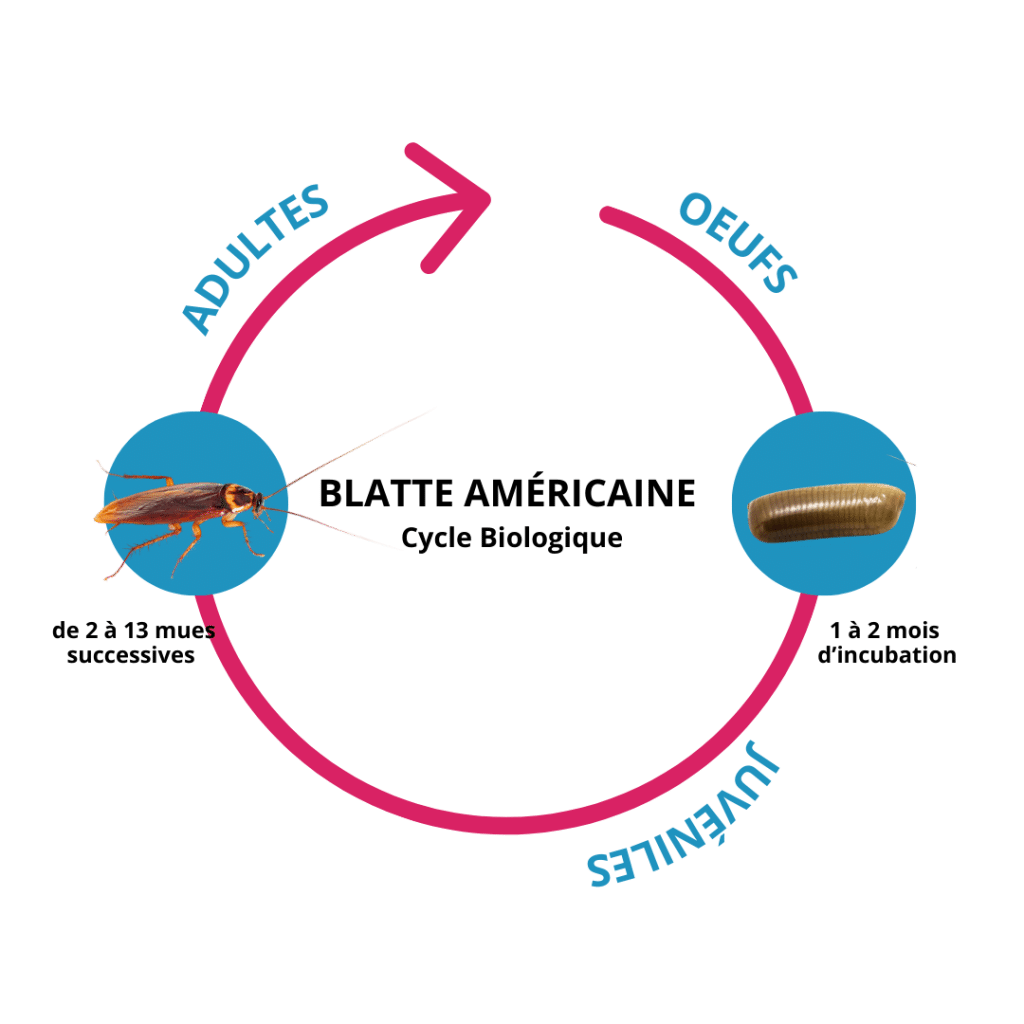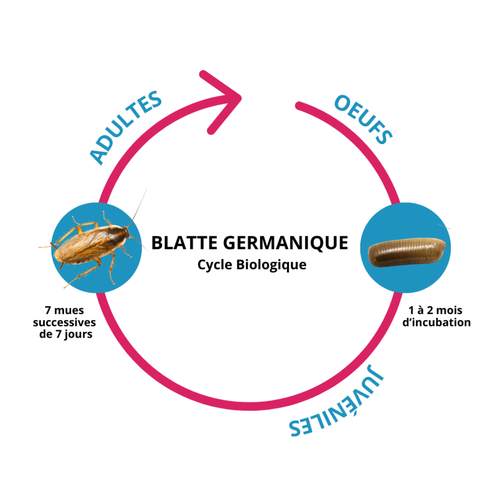 - Cycle de vie : La femelle porte ses oeufs dans une capsule nommée « oothèque" située à l'extremité de son abdomen. D'un brun brillant. cette oothèque est rectangulaire et mesure 7mm de long et 3mm de large. Chaque oothèque contient de 20 a 50 oeufs selon les individus et selon l'alimentation. La période d'incubation des oeufs est de 17 jours. Le cycle de vie complet de la blatte germanique s’étend entre 4 et 6 mois.