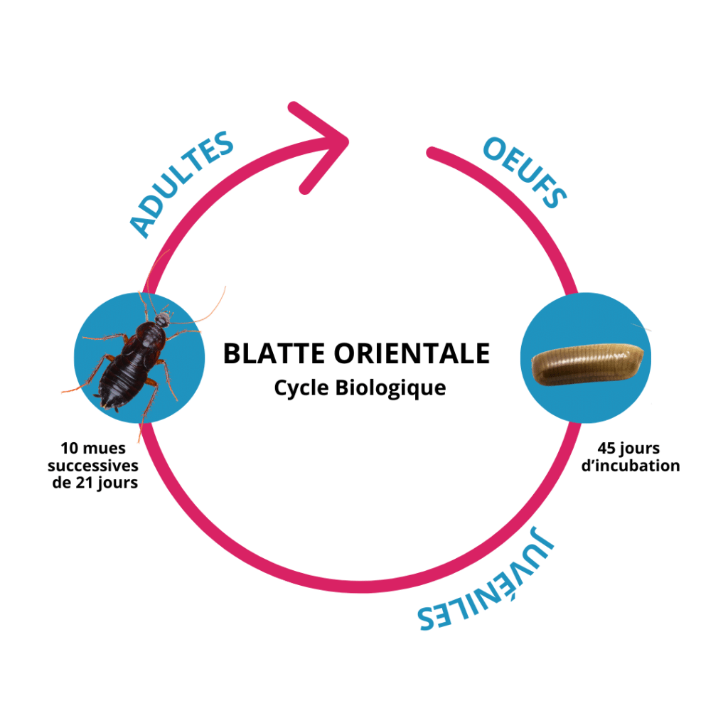 - Cycle de vie : Chaque oothèque peut contenir jusqu'à 18 oeufs. La femelle pond un maximum de 10 oothèques au cours de son existence. La période d'incubation des oeufs est de 45 jours. Le cycle de vie complet de la blatte orientale s'étend entre 7 et 13 mois.